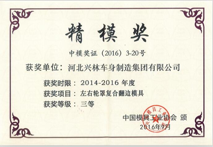 我公司于2016年6月28日至7月1日參加在上海新國際博覽中心舉行的第十六屆中國國際模具技術和設備展覽會,展會期間,中國模具工業(yè)協(xié)會繼續(xù)開展了兩年一度的“精模獎”評選活動,我公司憑借“左右輪罩復合翻遍模具”榮獲2014年~2016年度“精模獎”三等獎。